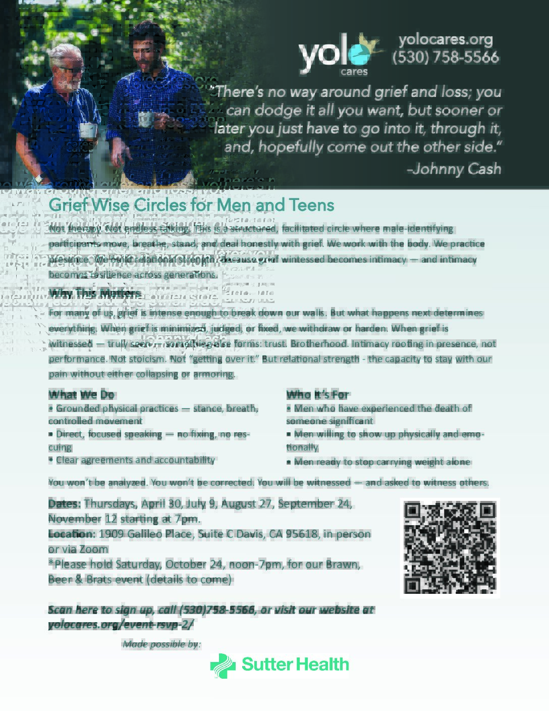 This is a structured, facilitated circle that combines grounded physical practices, honest conversation, and relational support. It is specifically designed for male-identifying participants who may struggle to access more traditional grief support settings.
